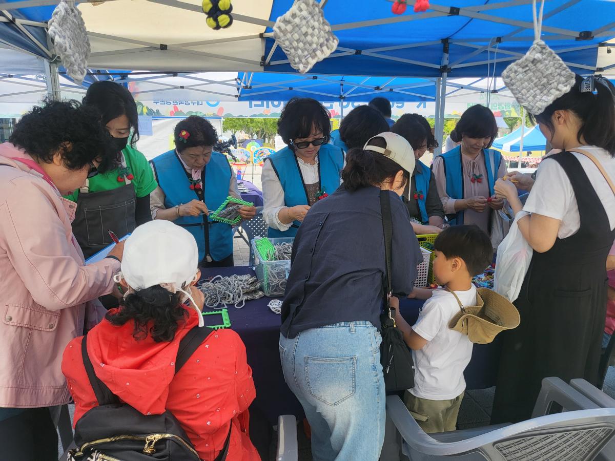 산업폐기물이었던 양말목을 재활용해 꽃 핀, 키링(열쇠고리) 만들기, 컵받침 등을 함께 만들며