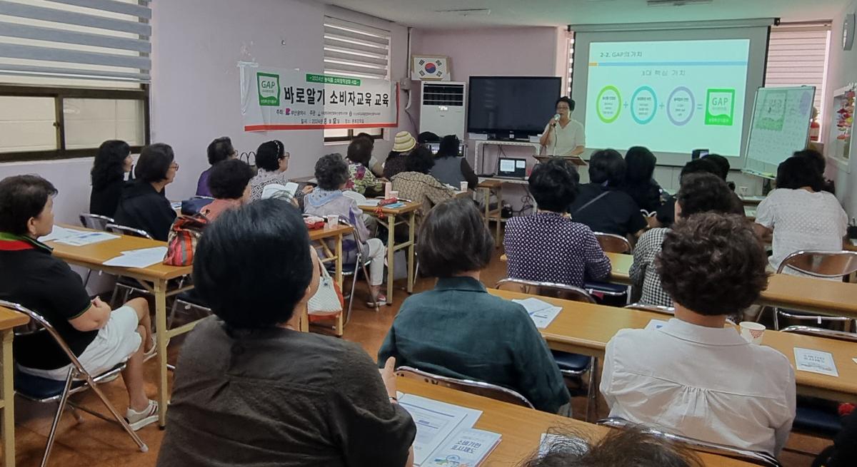 8월 13일에는 본회 강의실에서 주부 및 회원 43명을 대상으로 GAP 소비자리더육성을 위한 교육을 실시해