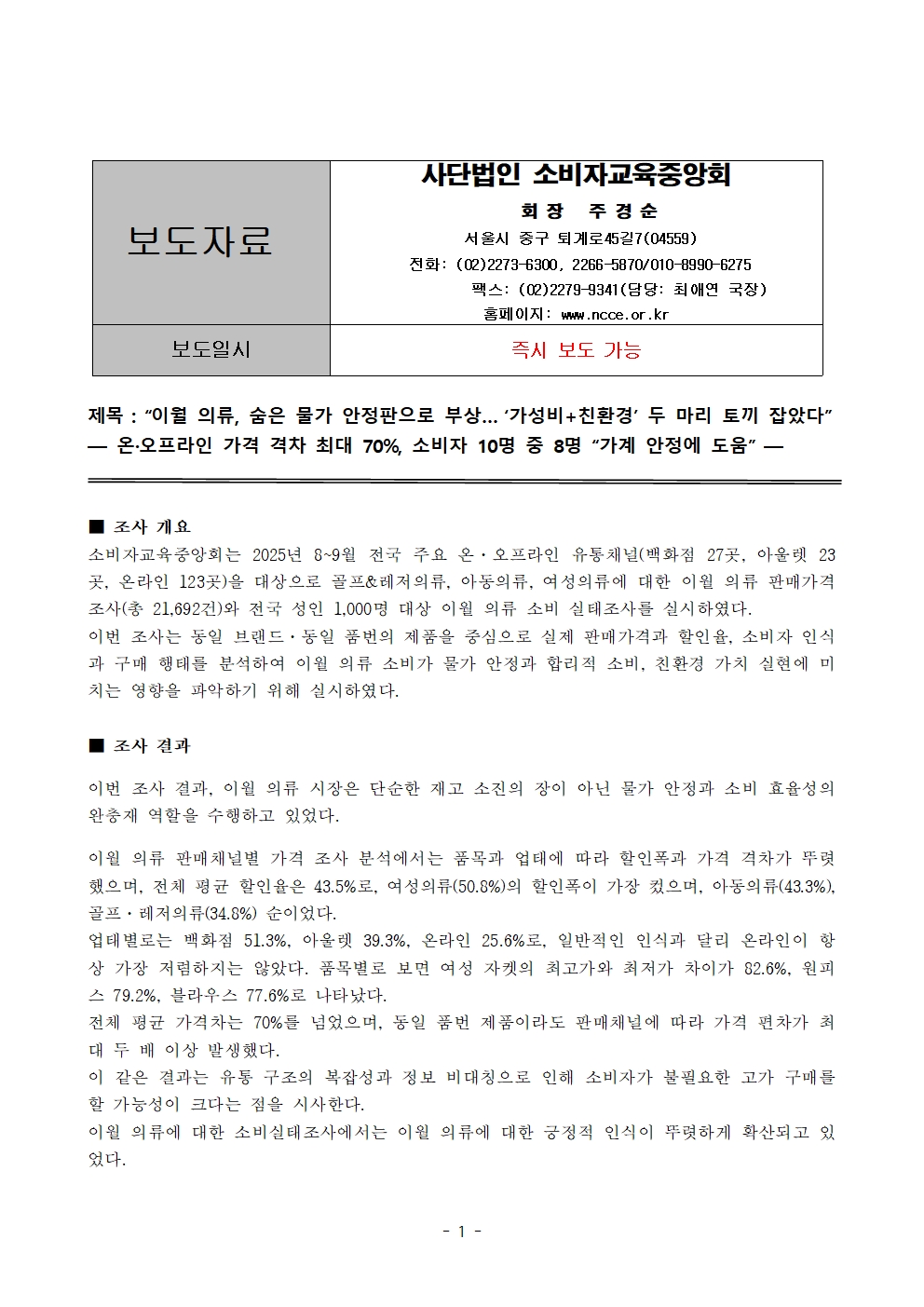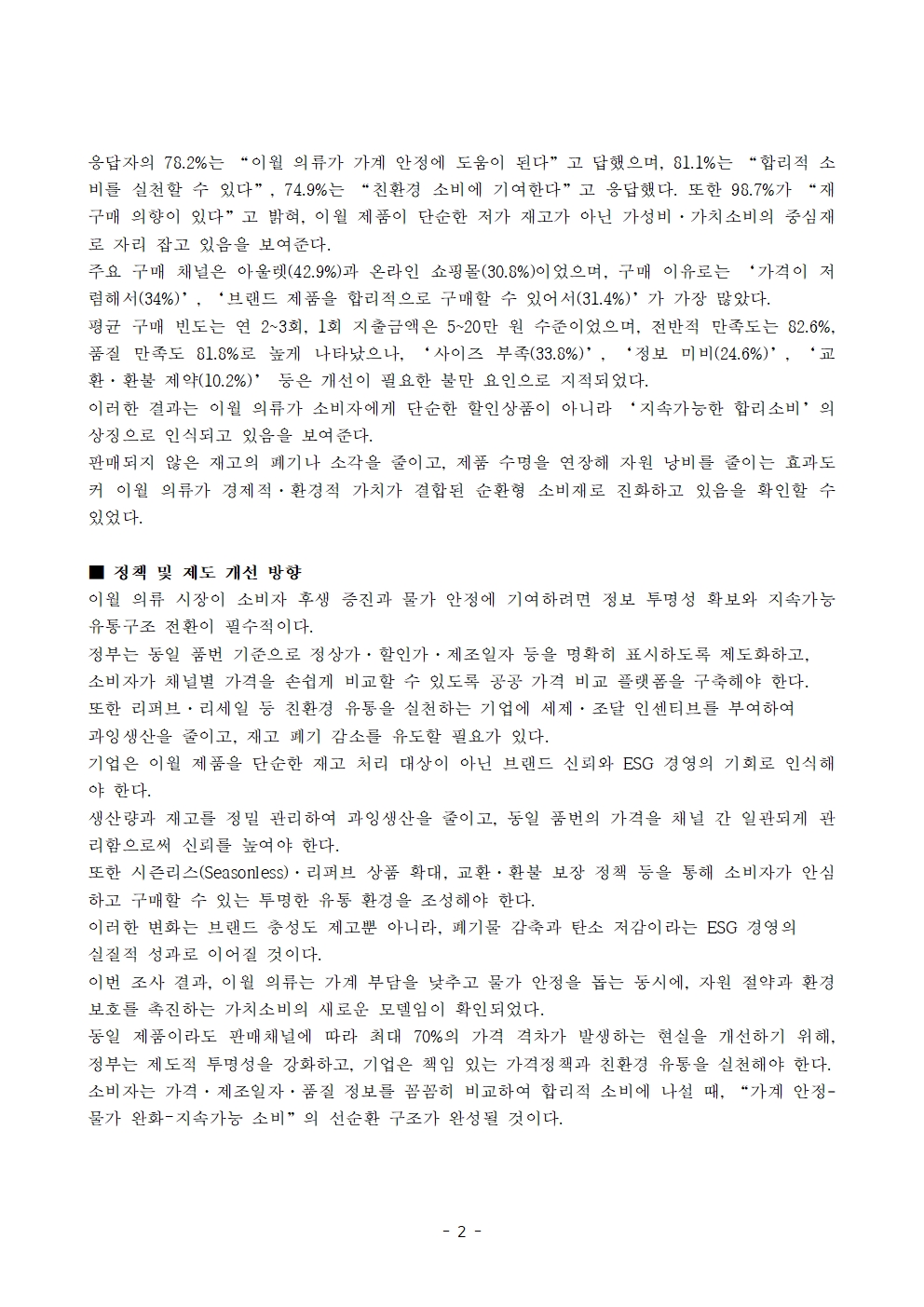 [보도자료] “이월 의류, 숨은 물가 안정판으로 부상… ‘가성비+친환경’ 두 마리 토끼 잡았다” — 온·오프라인 가격 격차 최대 70%, 소비자 10명 중 8명 “가계 안정에 도움