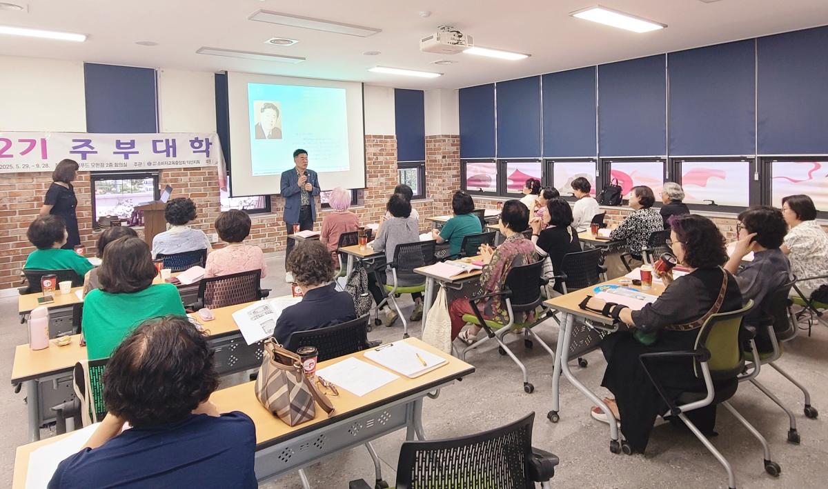 신입생 28명이 참석한 가운데 ‘제2기 주부대학’ 개강식을 갖고 1회 수업을 진행하고 있다. 6월 5일, 12일, 19일 26일과 7월 3일, 10일 유기상 전 고창군수, 이남호 전북연구원장, 두재균