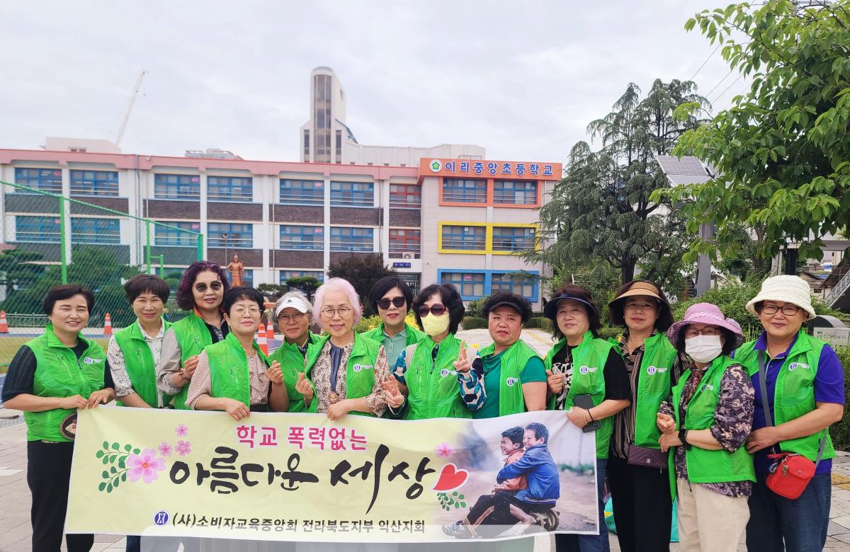 익산시지회 회원 13명은 6월 24일 익산 중앙초등학교 앞에서 '학교 폭력없는 아름다운 세상'이란 슬로건